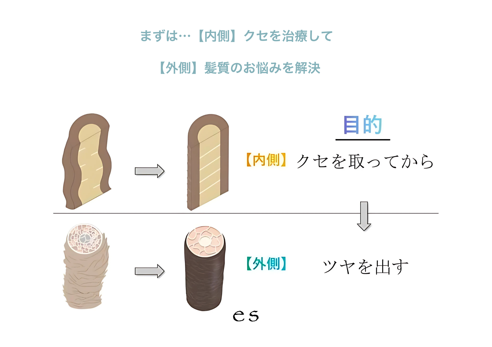 特に髪質改善ストレート、髪質改善トリートメントを中心に美髪をご提案させていただきます。改善元の原因が「癖」の場合はまず「髪質改善ストレート」をご提案させていただきます